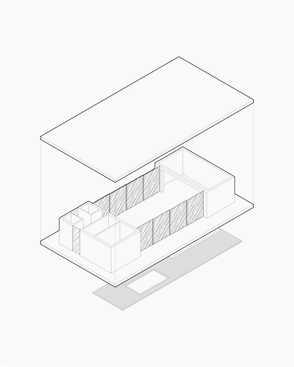 No pavimento térreo, que apresenta vocação para aglutinar estes ambientes, toda a circulação vertical, áreas técnicas e operacionais foram condensado em um eixo único, um bloco monolítico, que ao mesmo tempo organiza e libera o fluxo dos ambientes de convívio, promovendo espaços amplos e integrados. No pavimento superior se desenvolvem os ambientes íntimos, organizados na malha estrutural e orientados de acordo com as influências do entorno para otimizar o conforto ambiental.